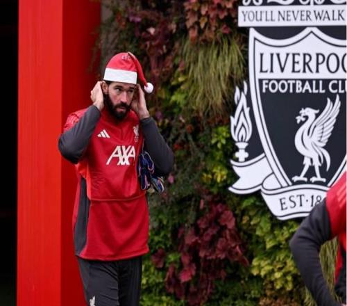 当地时间12月24日上午,利物浦球员戴上圣诞帽参加训练,并且进行了传统的合影。