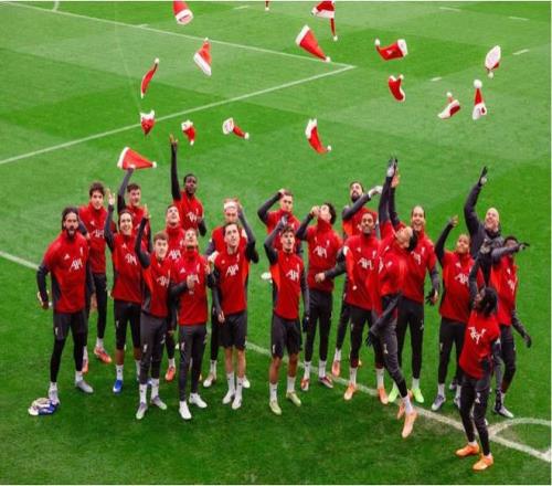 今天是圣诞节前夕,在这一天,利物浦的球员和教练们都戴上了圣诞帽来到训练场,并且进行了大合影,随即一起将圣诞帽掷向空中。